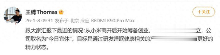 就在1月8日,王腾本人在社交平台正式官宣:离开小米后,他已经开始筹备创业,新公司正式取名为“今日宜休”! 这名字一听就很有故事——“今日宜休”,透着一种“在忙碌的现代生活中,提醒大家关爱自己”的禅意和关怀。而他的创业目标,也正是直击当代人的痛点:研发睡眠健康相关的产品!
